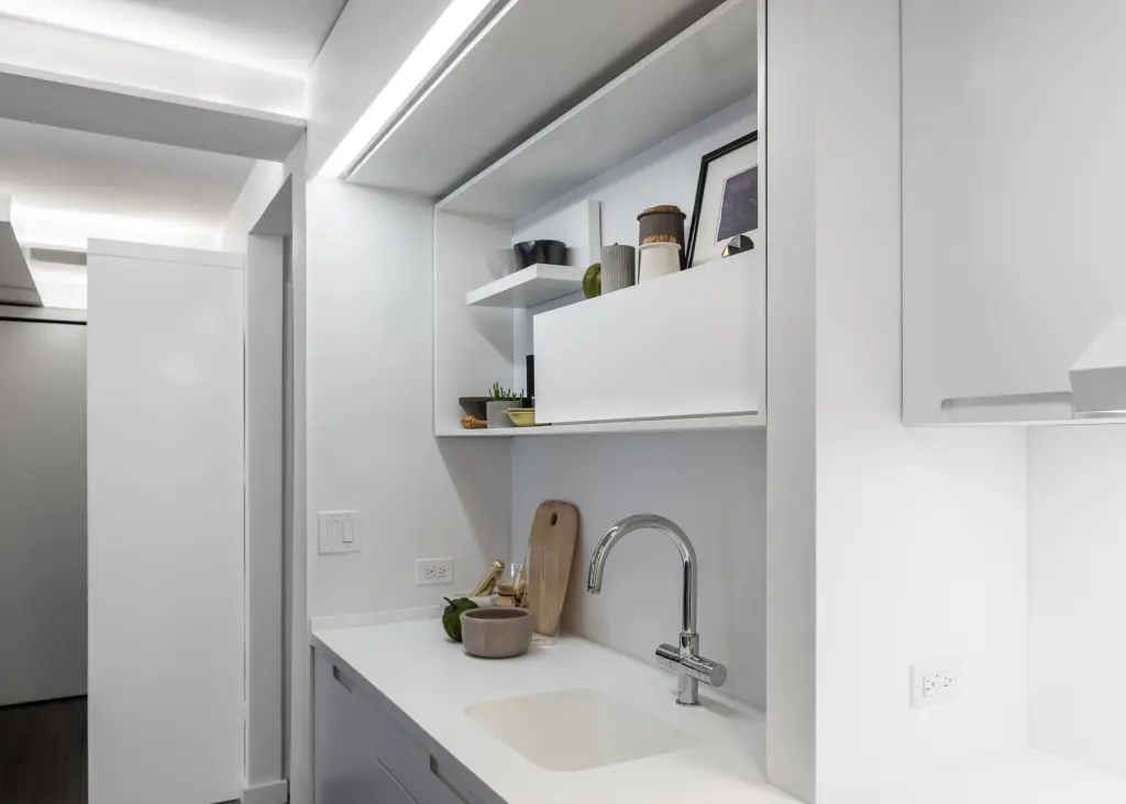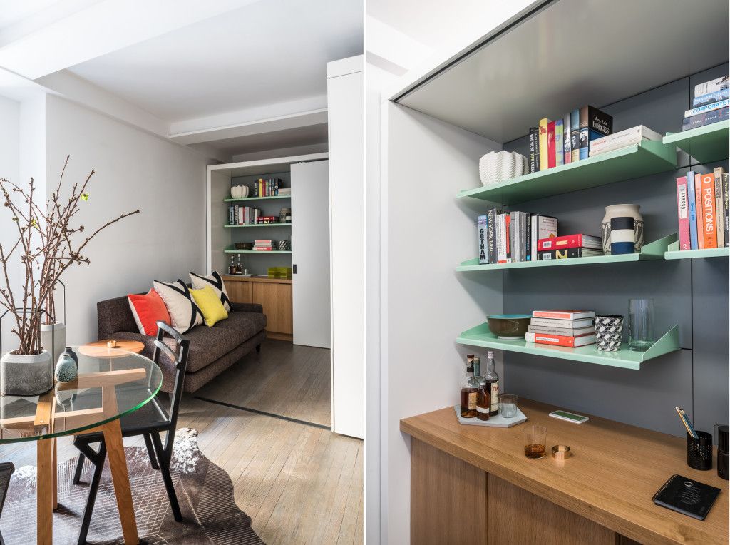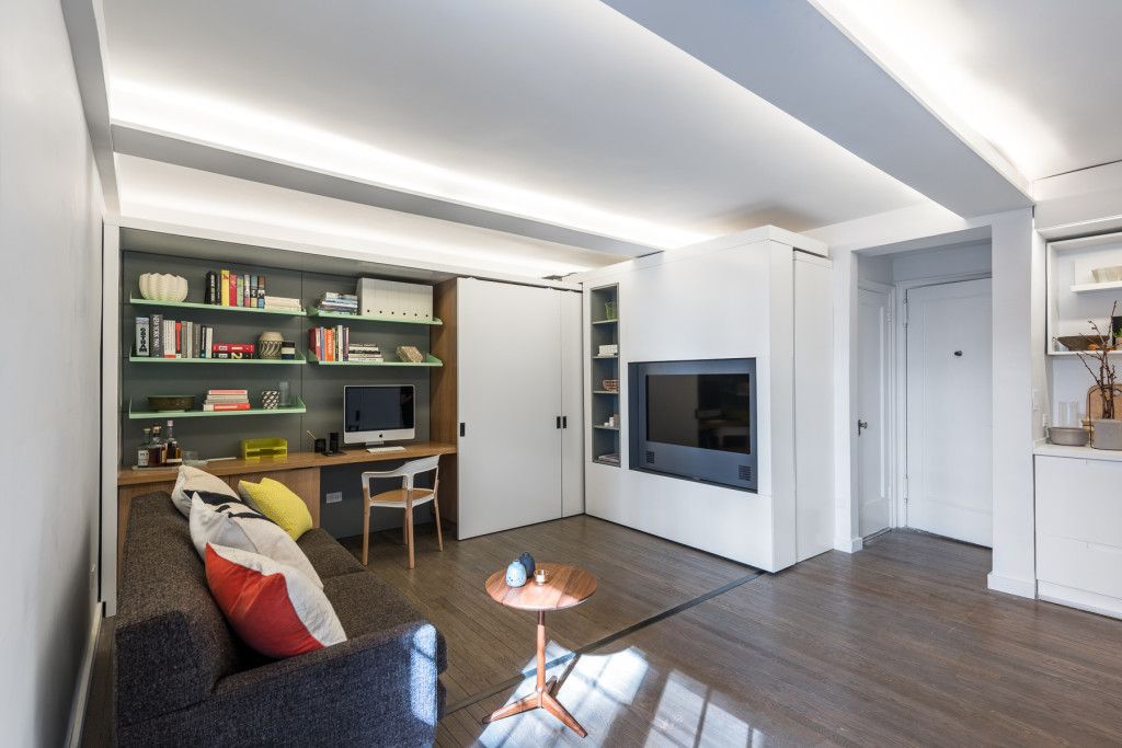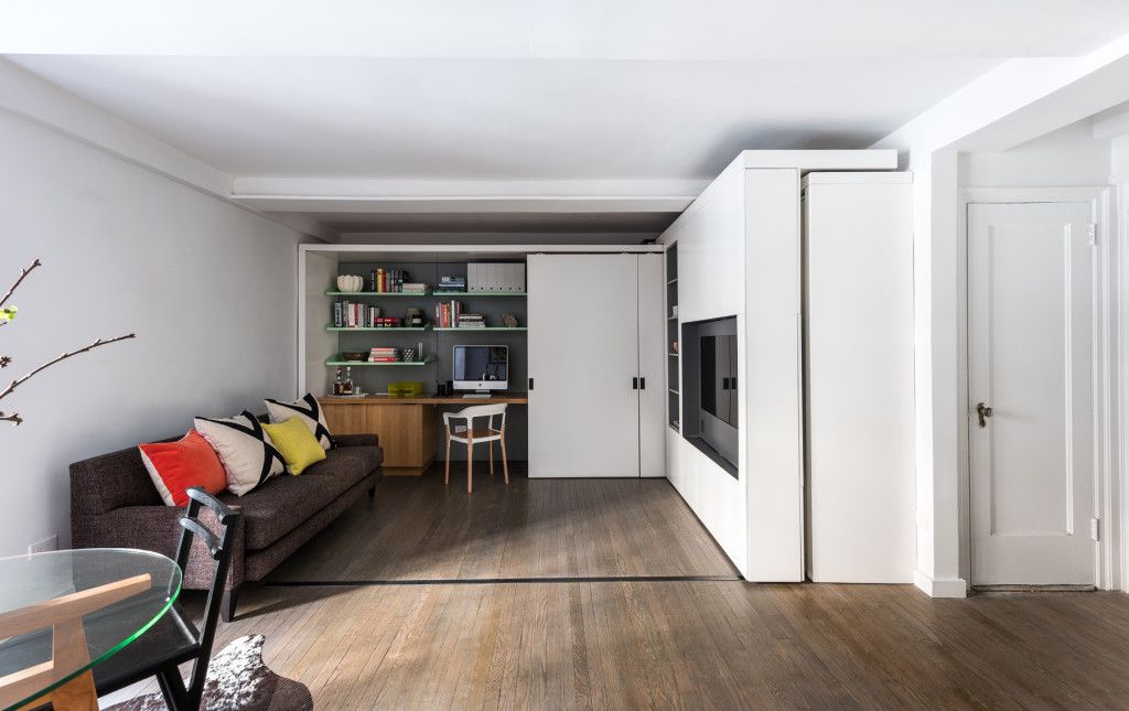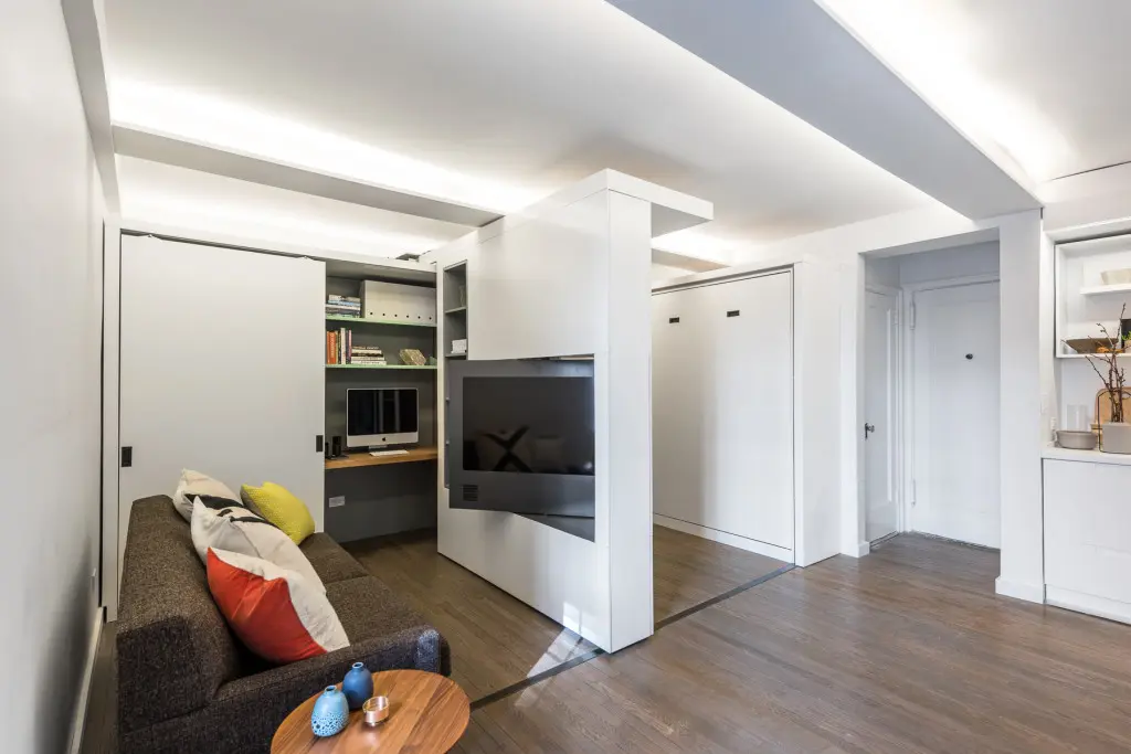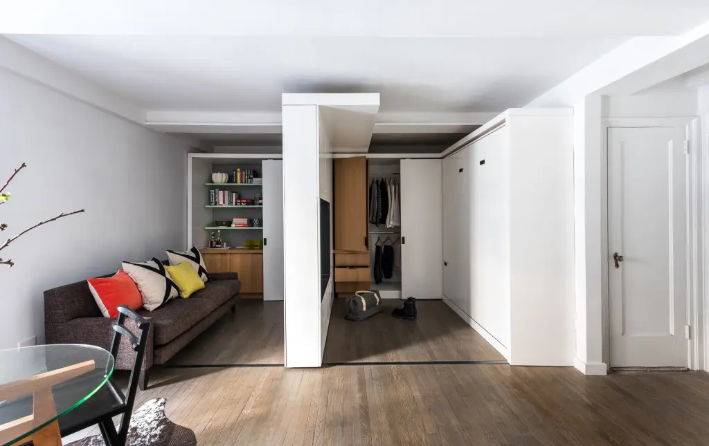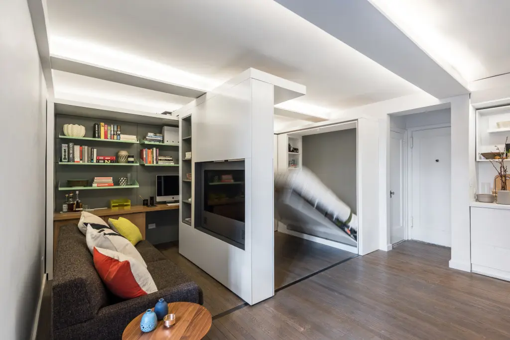 Aceastagarsoniera de aproximativ 35 de metripatrati din Manhattan are un perete motorizat care face ca dormitorul si dressing-ul sa dispara” in timpul zilei facand loc living-ului. Perete motorizat reprezinta cea mai recenta descoperire din domeniul arhitecturii, el este alcatuit din elemente mecanice si electrice care ajuta la o configurare inteligenta a spatiilor mici.