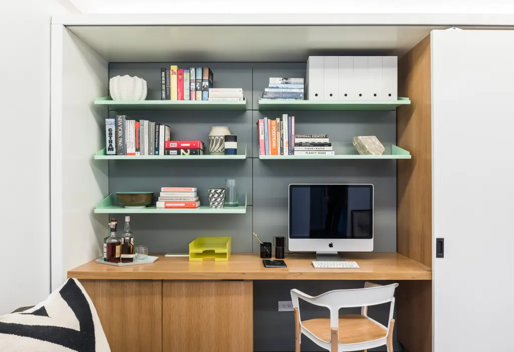 In zona in care este instalat peretele motorizat se afla dulapurile si un birou, fapt care face sa spatiul sa fie multi functional. Iar in timpul zile, cand patul este inchis, spatiile de depozitare pot fi usor de accesat.