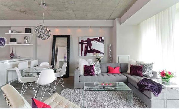 Pernele decorative pot completa stilul sau tematica cromatica a unui decor. Daca culoarea predominanta este violetul, cateva accente nuantate se pot regasi si pe canapeaua cu perne.