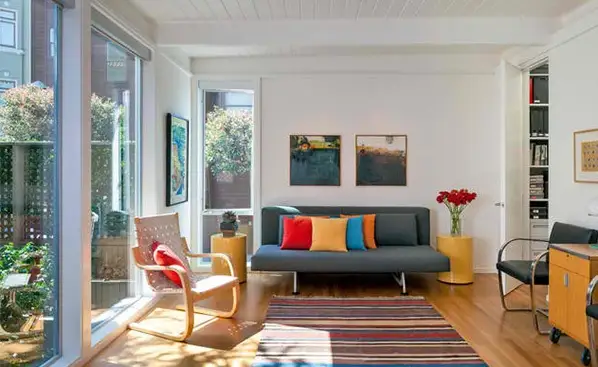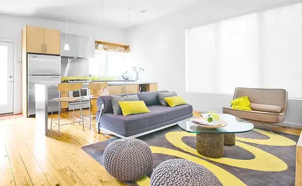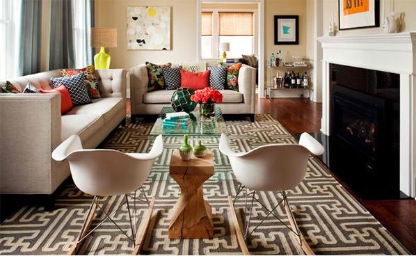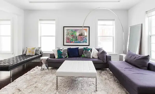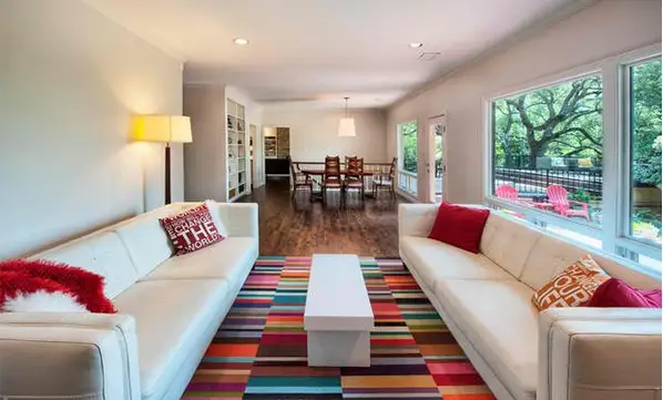 Daca albul predomina in design-ul ales, atunci colorati livingul cu materiale colorate. O gama variata de nuante pot fi folosite pentru un efect vesel. Asortati cu un covor cu textura multicolora si veti cuceri orice priviri.
