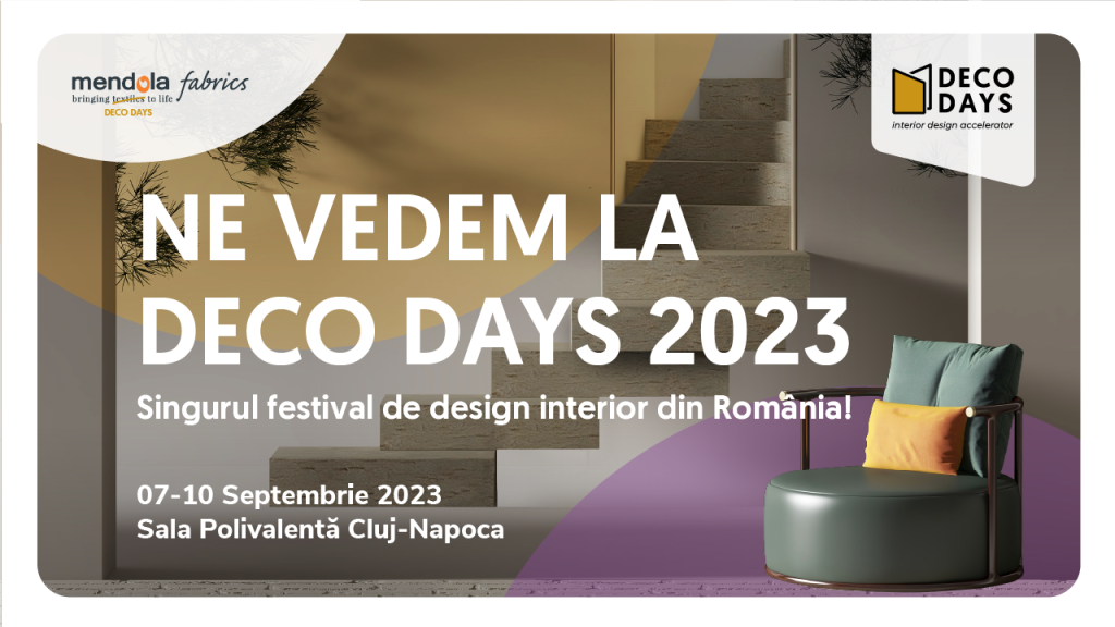 Cluj-Napoca, 24 august 2023: Deco Days, eveniment dedicat design-ului de interior, organizat de Mendola Fabrics, cel mai mare brand de perdele și draperii din România, va avea loc anul acesta între 7 și 10 septembrie, în Foaierul Sălii Polivalente din Cluj-Napoca.