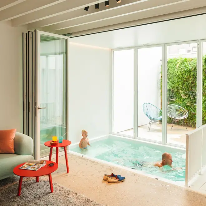 Cei care s-au ocupat de proiect au transformat sufrageria intr-un spatiu multifunctional. Piscina amenajata in interior se poate transforma si in piscina exterioara datorita peretilor pliabili de sticla. Odata pliati peretii sufrageria devine un balocn mai mare cu vederea spre o gradina verticala plina de verdeata. Este o idee buna de amenajare a unui spatiu mic.
