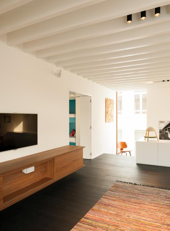 Desi nu au avut la dispozitie prea mult spatiu cu care sa lucreze arhitectii au reusit sa puna in valoare fiecare metru patrat. Restul casei arata si el foarte bine, sunt imbinate culori cu nuante placute si vibrante, iar peste tot predomina lumina naturala. Podelele din lemn (si gresie, pe alocuri) de culoare inchisa contrasteaza cu pereti alibi si dau senzatia de spatialitate.