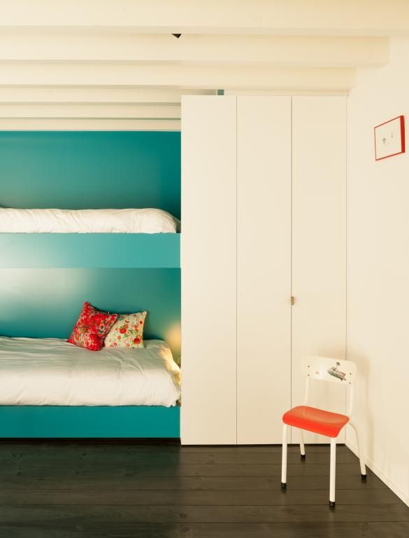 Dormitorul copiilor are un pat supraetajat vopsit intr-o culoare de un verde placut , care este ingenios construit, astfel ca pare incastrat in perete. Baia are si ea ceva special, contine o cabina de dus colorata in galben complet, cu o para de dus care atarna din tavan.
