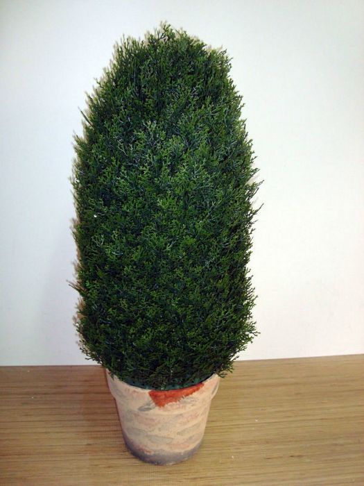 Dintre plantele foioase cu frunze persistente, cel mai des utilizate sunt: cimisirul, diferite varietati de Prunus laurocerasus si specii de rododendroni. Dintre conifere, cele mai potrivite pentru cultura in ghivece sunt speciile pitice: pinul de munte sau molidul, varietatea “Conica”. La fel de potrivit este si chiparosul sau ienuparul.