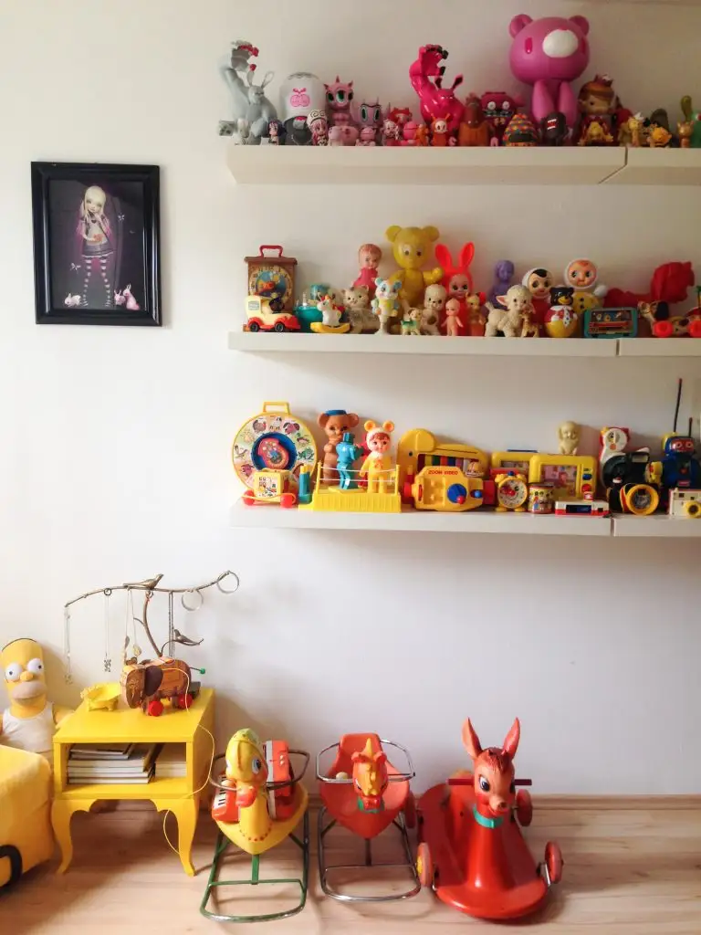 In ceea ce priveste colectiile, variaza de la jucarii de vinil, jucarii vechi, carti pentru copii in toate limbile, memorabilia de la concerte, balansoare vintage de copii, benzi desenate, portelan si bibelouri vechi, carti de arta lowbrow si quilturi.