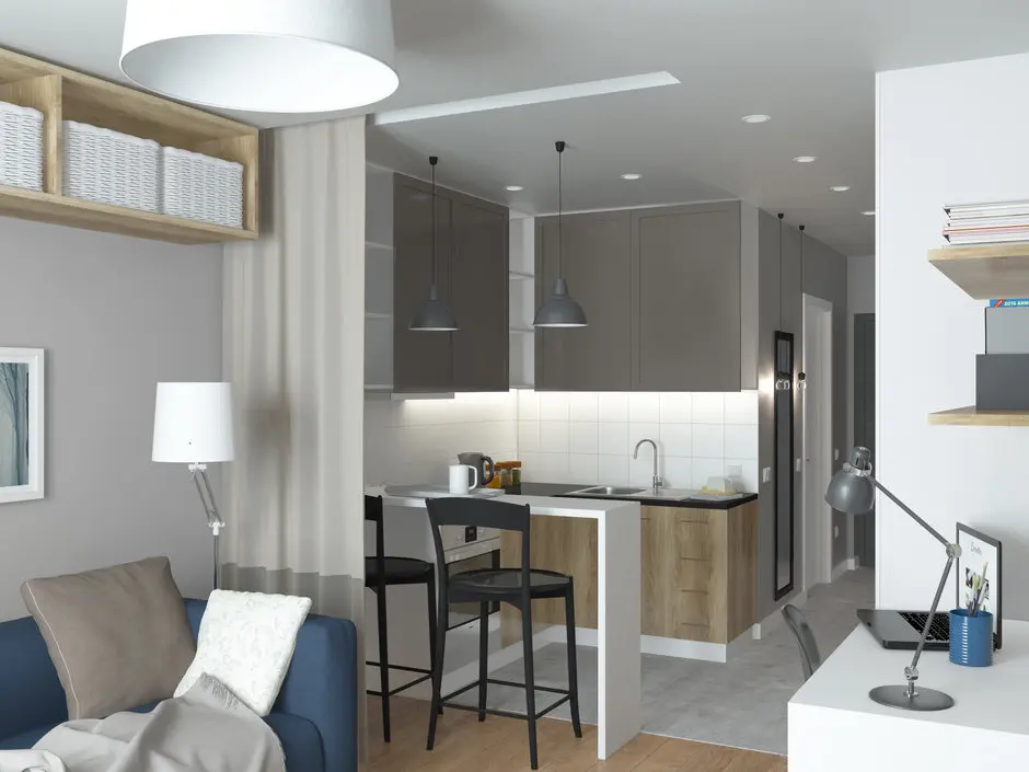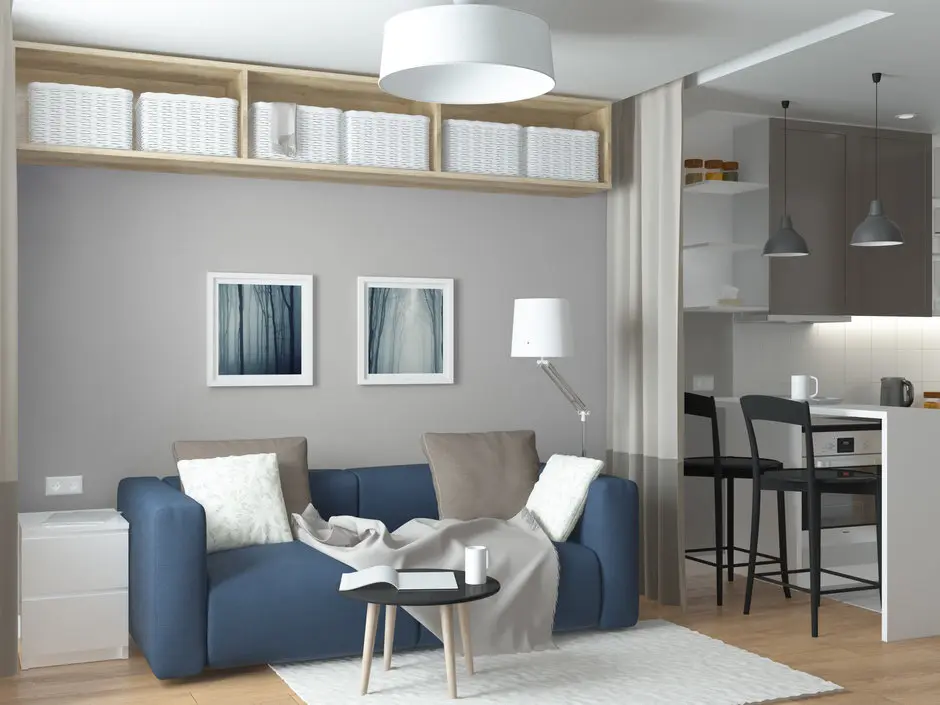 Spatiul bucatariei este separat de restul camerei printr-o draperie ce poate fi trasa pentru a delimita vizual zona de gatit de coltul destinat dormitului. Un sistem de rafturi deschise ofera spatiu pentru o depozitare creativa. Adaugam si o masuta de cafea, precum si un corp cu sertare ce poate fi usor folosit ca noptiera si iata conturata zona de zi.