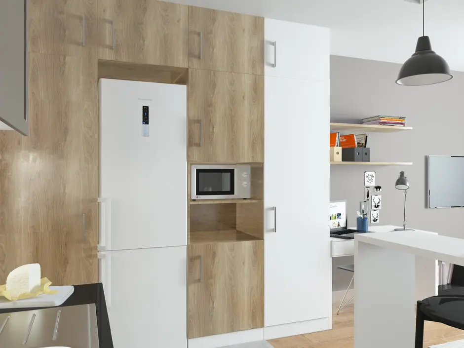 La intrarea in locuinta, a fost amenajata principala zona de depozitare. In continuarea ei, vom regasi bucataria, impartita pe 2 laturi. Pe de o parte vom gasi frigiderul, iar pe celealta parte, zona de gatit, dulapurile si un bar amenajat ca un mini-dining. Mobilierul este compact si ales cu atentie pentru a satisface nevoile cuplului ce locuieste in acest spatiu.