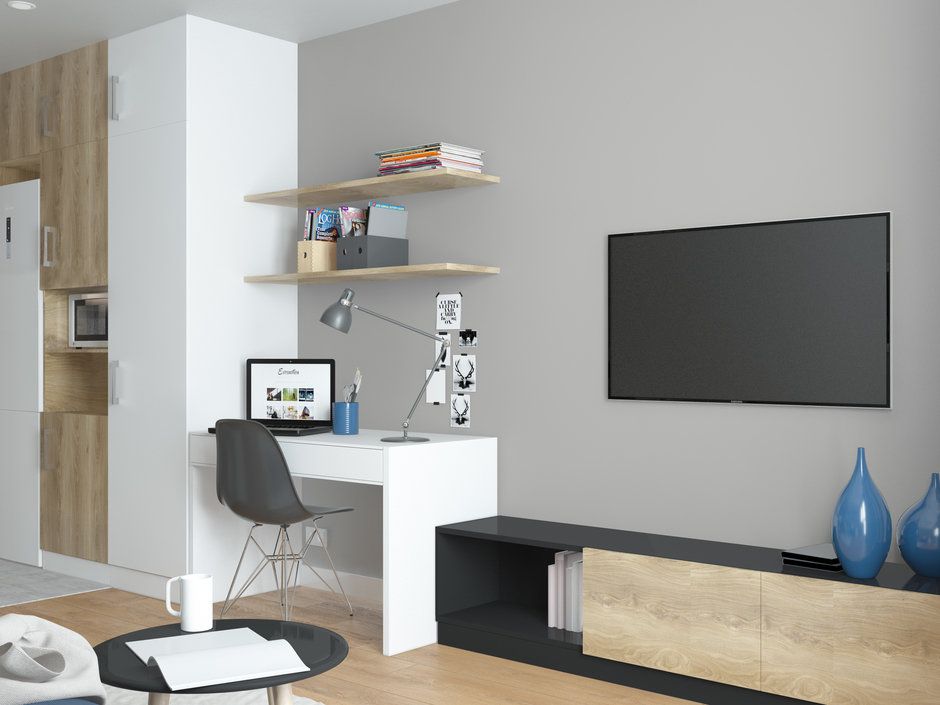 Spatiul bucatariei este separat de restul camerei printr-o draperie ce poate fi trasa pentru a delimita vizual zona de gatit de coltul destinat dormitului. Un sistem de rafturi deschise ofera spatiu pentru o depozitare creativa. Adaugam si o masuta de cafea, precum si un corp cu sertare ce poate fi usor folosit ca noptiera si iata conturata zona de zi.