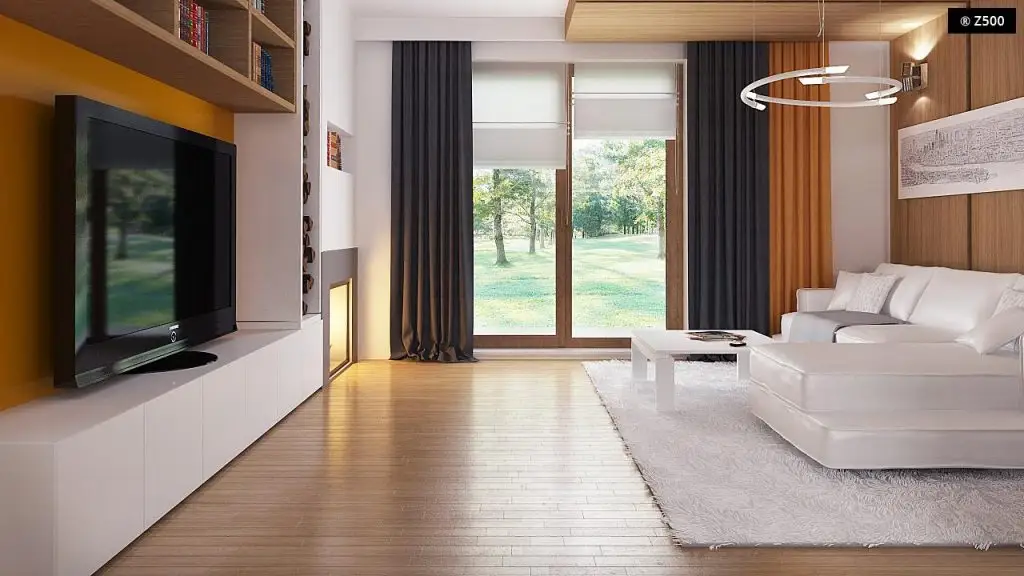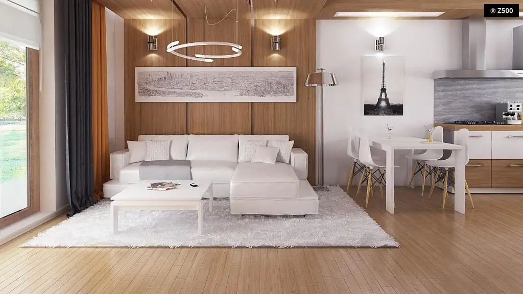 Esentele de lemn natur si albul predominant contureaza un decor luminos si calduros. Suprafetele vitrate sunt pozitionate echilibrat astfel ca spatiul primeste suficienta lumina naturala. Din living se face iesirea pe terasa.