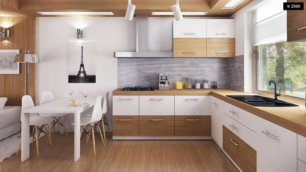 Pentru amenajarea bucatariei se merge pe o configuratie in forma de L, ideala pentru o bucatarie de familie sau pentru a intretine oaspetii. Dispunerea ferestrei asigura un iluminat eficient. Dupa cum vei putea remarca in proiect, exista o incapere de aproximativ 2,5 metri patrati ce poate fi folosita pe post de camara.