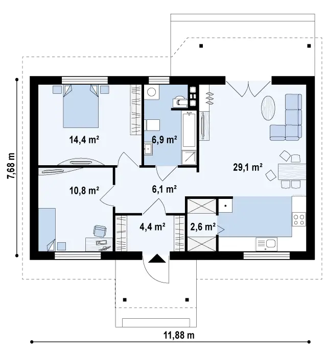 Te-ai gandit vreodata cum ai vrea sa arate casa ta ideala? Cu siguranta ti-ai imaginat-o in multe moduri, cu terasa, veranda, gradina, spatioasa la interior. Iti propun pentru azi un proiect de casa mica, cu un singur nivel, cu o suprafata utila de 74 metri patrati.