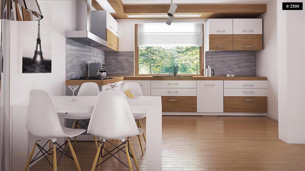 Pentru amenajarea bucatariei se merge pe o configuratie in forma de L, ideala pentru o bucatarie de familie sau pentru a intretine oaspetii. Dispunerea ferestrei asigura un iluminat eficient. Dupa cum vei putea remarca in proiect, exista o incapere de aproximativ 2,5 metri patrati ce poate fi folosita pe post de camara.