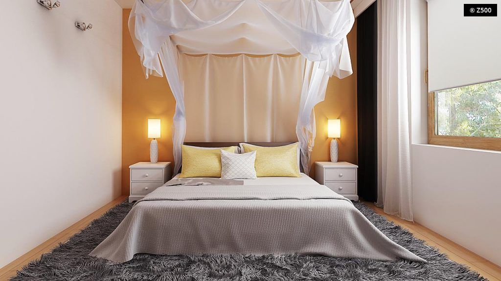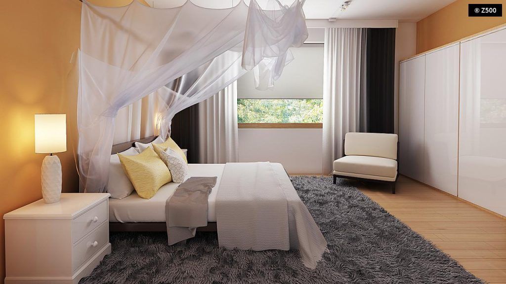 Amenajarea minimalista este pastrata si pentru dormitor. Suprafata de 14 metri patrati permite instalarea unui pat si a unui dulap tip dressing pentru haine. In cazul de fata, vorbim despre o ilustrare simpla, cu elemente de baza care ne permit sa vizualizam mai usor o posibila dispunere a elementelor amenajarii.