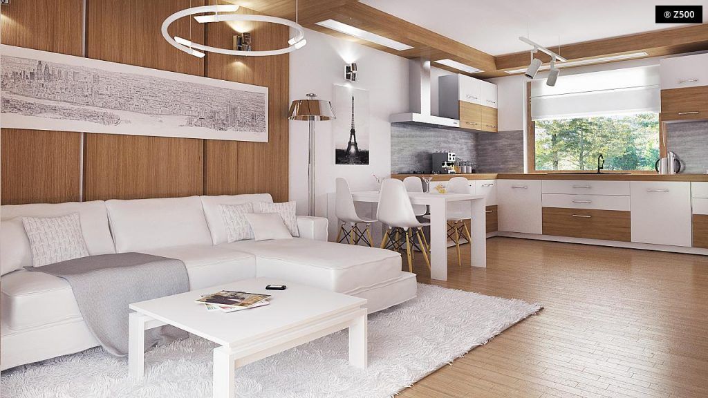 Esentele de lemn natur si albul predominant contureaza un decor luminos si calduros. Suprafetele vitrate sunt pozitionate echilibrat astfel ca spatiul primeste suficienta lumina naturala. Din living se face iesirea pe terasa.