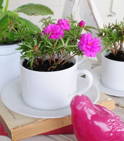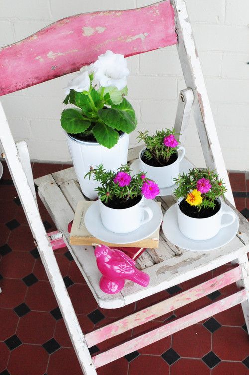 Alegeti plante cu flori colorate, cu dimensiuni mici pentru a incapea eficient in cesti. E bine ca marimile cestilor sa varieze, pentru mai multa diversitate. Le puteti muta mai usor prin casa sau aseza cu usurinta pe pervazul ferestrei sau in balcon.