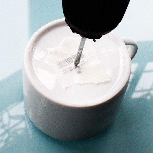 Suport pentru flori din cesti: se face o gaura in baza cestii cu burghiul. Se foloseste o banda izolatoare pentru a preveni alunecarea in timpul gauririi.