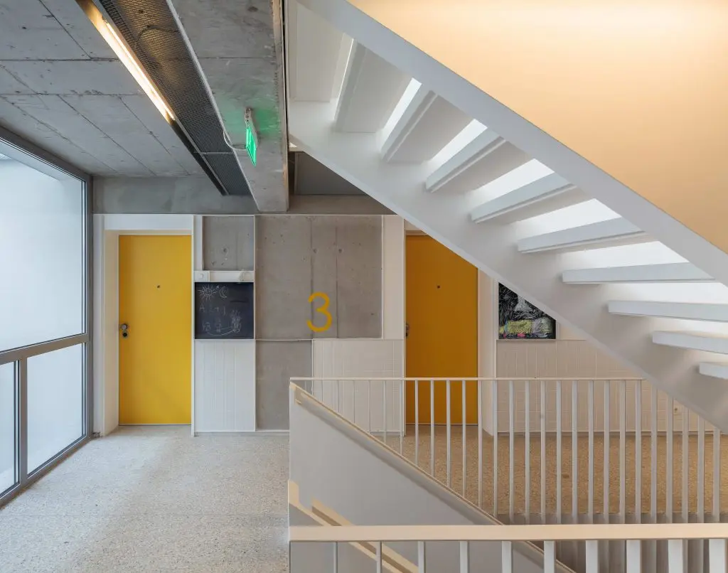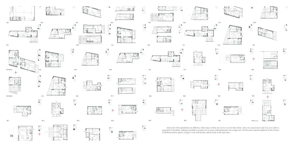 La interior, arhitectii s-au jucat cu volumele in asa fel incat spatiile de locuit, desi mici, sa fie suficiente pentru traiul normal al unei familii, iar spatiile comune au primit mai suprafete mai mari pentru a incuraja interactiunea. Un alt avantaj al acestui complex este acela ca niciun apartament nu seamna cu celalalt, facand din fiecare spatiu un loc unic pentru fiecare familie.