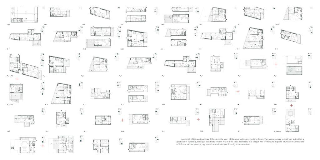 De asemenea, spatiile destinate apartamentelor pot fi locuite individual sau, pentru cei care isi doresc o suprafata mai mare pot fi achizitionate in pereche si conectate foarte usor intre ele atat pe orizontala cat si pe verticala. In exteriorul acestor apartamente, pe proprietari ii asteapta terase, holuri, un mic bar, spatii comerciale si o curte interioara.