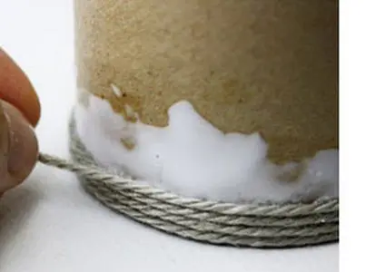 Adaugati lipici la baza tubului si incepeti sa rulati de jur imprejur cu ata mai groasa, preferabil colorata. Pe masura ce inaintati cu ata, mai adaugati treptat lipici.