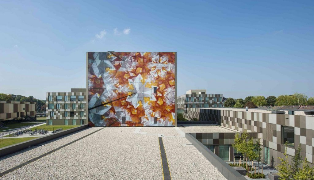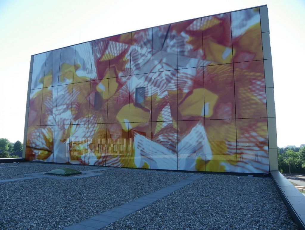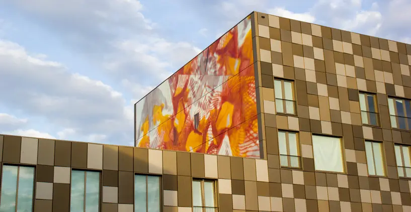 Deschide GaleriaModelul reprezinta un desen abstract format din nuante de culori ca portocaliu, roz si galben, iar imaginea in ansambu ofera o senzatie impresionanta. Pentru a realiza lucrarea cei de la Driessen + van Dejine au lucrat in parteneriat cu o alta companie, Si-X, specializata in decorarea cladirilor de sticla.