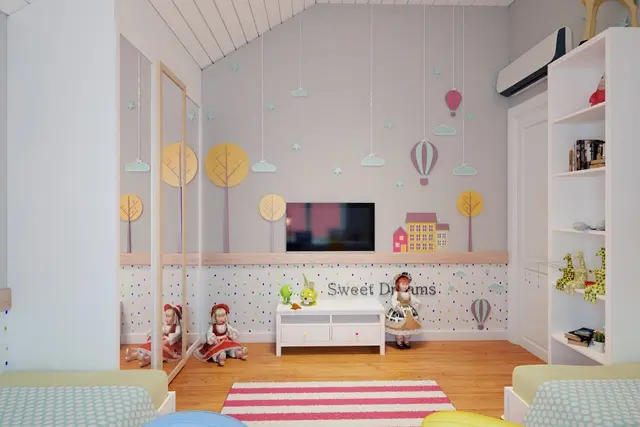 Camera fetitelor culori pastelate, vesele si desene pe pereti