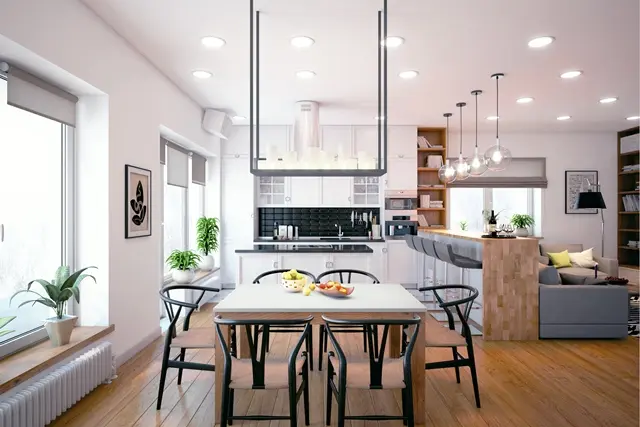 Zona de dining se afla in continuarea bucatariei; interesant este felul in care spatiul este evidentiat prin corpul de iluminat