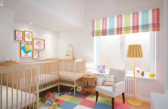 Camera actuala a celor trei bebelusi mult alb si accente de culori