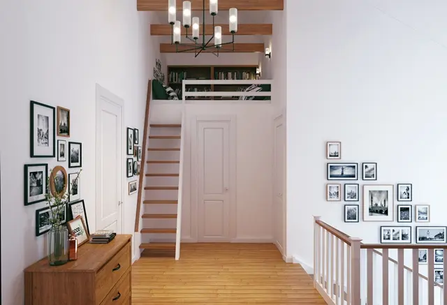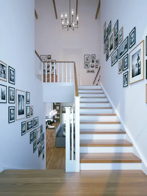 Scarile care duc la etaj un spatiu personalizat cu multe tablouri