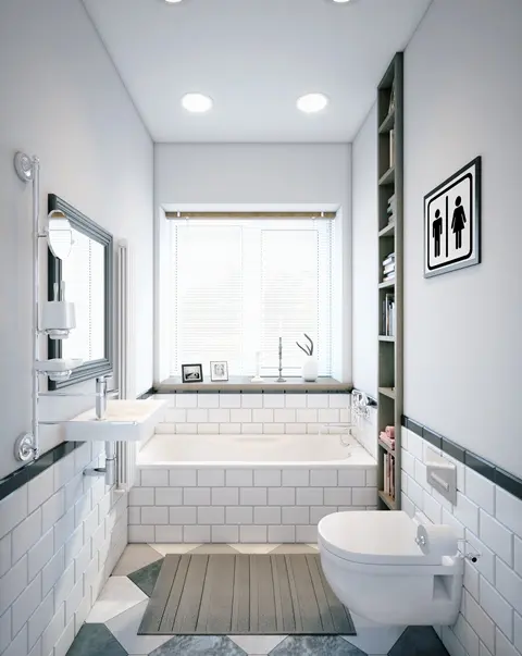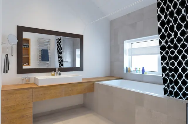 Rama neagra de la oglinda un contrast placut cu albul peretilor si al obiectelor sanitare