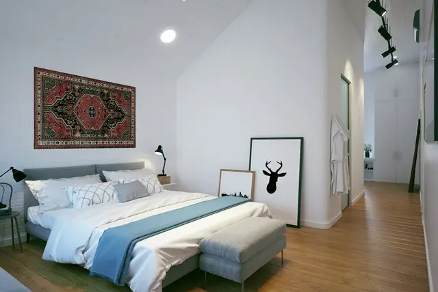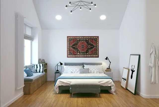 Dormitorul principal amenajat intr-un stil pur scandinav cu elemente de originalitate cum ar fi carpeta orientala care vine ca o aditie interesanta pentru spatiu