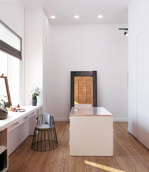Pentru a crea impresia de camera unica, designerii au optat pentru combinarea zonei de dormit cu dressingul si baia. Colturile peretilor au fost rotunjiti pentru a spori efectul de unicitate, aceasta trasatura fiind de fapt amprenta originala a celor de la Geometrium
