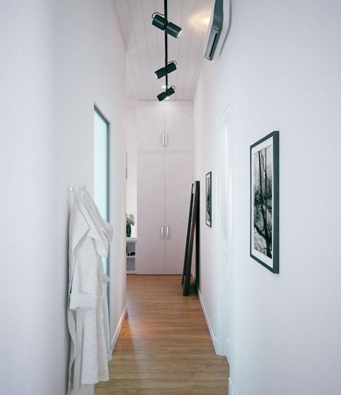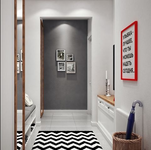 Holul a fost conceput ca o zona practica pentru depozitarea lucrurilor de zi cu zi. Pentru un plus de dinamism, designerii au mizat pe contrastul alb-negru si pe accente de rosu.