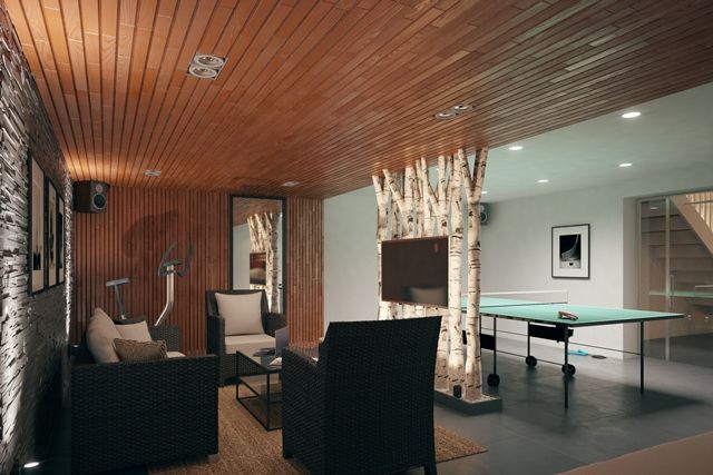 Avand aceste lucruri in minte, echipa de la Geometrium s-a concentrat pe imbinarea spatiilor utile cu cele destinate divertismentului. Astfel, la subsol a fost amenajat un spatiu alocat sportului cu masa de ping-pong si echipamente pentru fitness. Parterul cuprinde zona de zi: holul principal, livingul, bucataria, zona de dining si o camera de oaspeti. Un detaliu interesant este zona de joaca pentru copii asezata in fata bucatariei – astfel, ei pot fi supravegheati in timp ce mama lor gateste. La etaj regasim dormitoarele parintilor si pe cele ale copiilor, fiecare camera avand baie proprie.