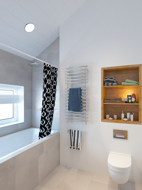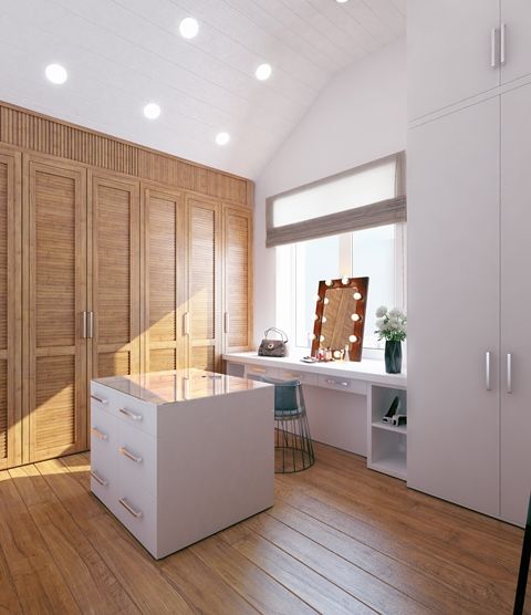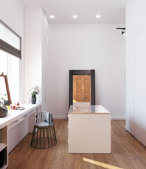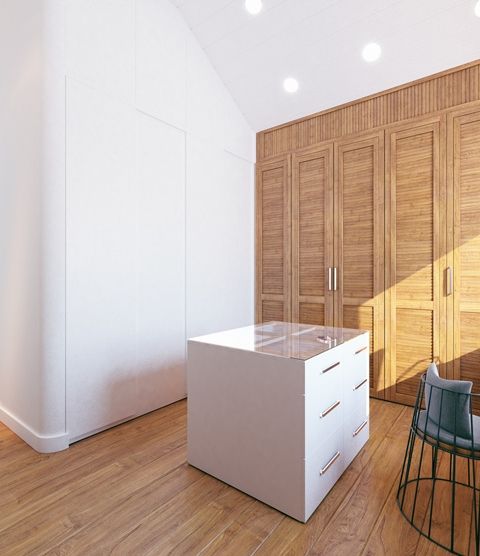 Pentru a crea impresia de camera unica, designerii au optat pentru combinarea zonei de dormit cu dressingul si baia. Colturile peretilor au fost rotunjiti pentru a spori efectul de unicitate, aceasta trasatura fiind de fapt amprenta originala a celor de la Geometrium