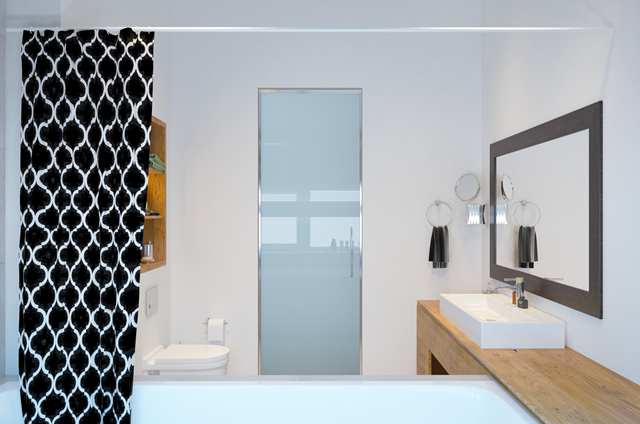 Usa de la baie este din sticla mata fiind o tranzitie discreta spre spatiul dormitorului in care este integrata.