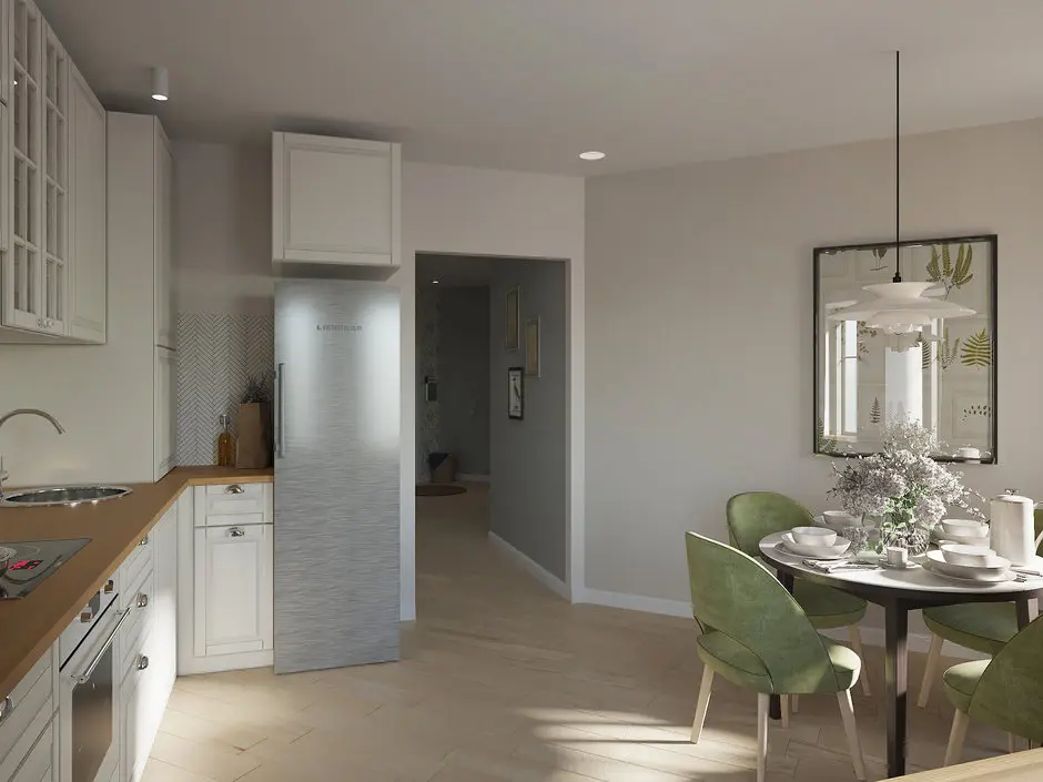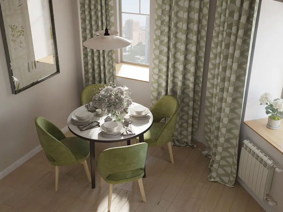 Dispunerea pe doua laturi asigura spatiile de depozitare si incorporarea electrocasnicelor, chiar daca una din laturi este mai redusa (cea cu frigiderul). Tonurile de verde de la nivelul scaunelor si draperiilor se integreaza minunat in contextul decorativ al acestei bucatarii.