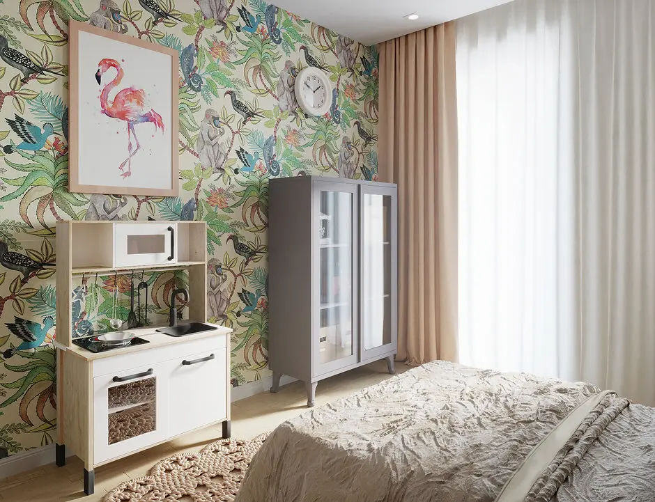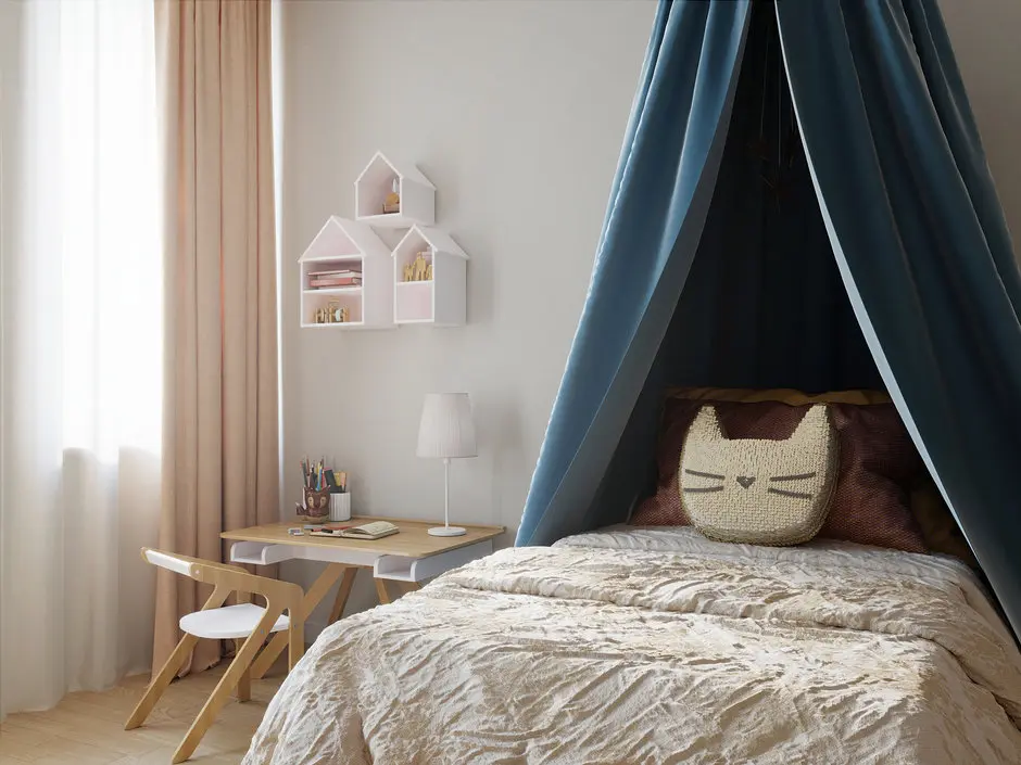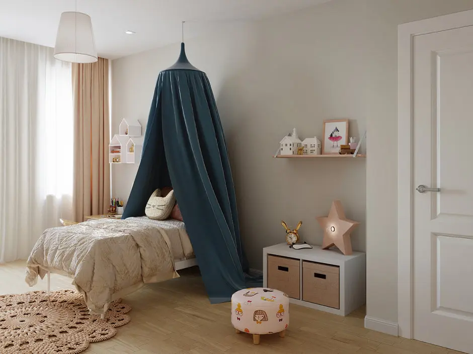 Camera fetitei atrage privirea printr-un intreg perete cu tapet vesel, completat de patul cu baldachin desprins din povestile cu zane. Amenajarea camerei este simpla, fara corpuri de mobilier care sa agreseze spatiul, exceptie fiind dulapul de haine de langa usa camerei.