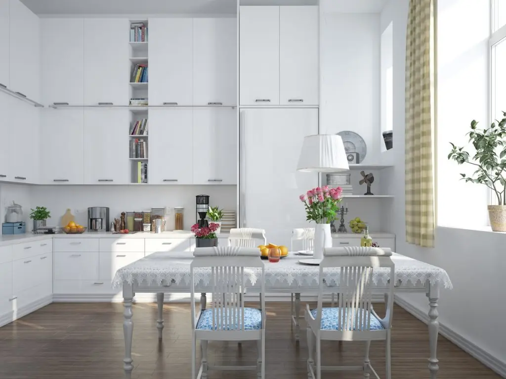 O astfel de abordare permite o depozitare variata, incluzand o mini-biblioteca, mai multe electrocasnice incorporate in mobilier sau chiar un spatiu de birou. Pentru a pastra totul cat mai luminos si aerisit, s-a optat pentru fronturi albe, cu un design modern, minimal. Stilistic, bucataria mizeaza pe o abordare scandinava, bazata pe functionalitate si cu o estetica redusa la esential. Locul de luat masa din mijlocul bucatariei merge inspre o zona de orientare clasica, fara a intra in dezacord cu stilul mai auster al nordicilor.