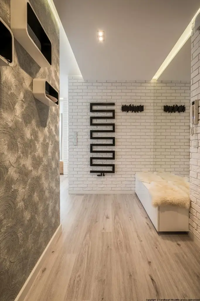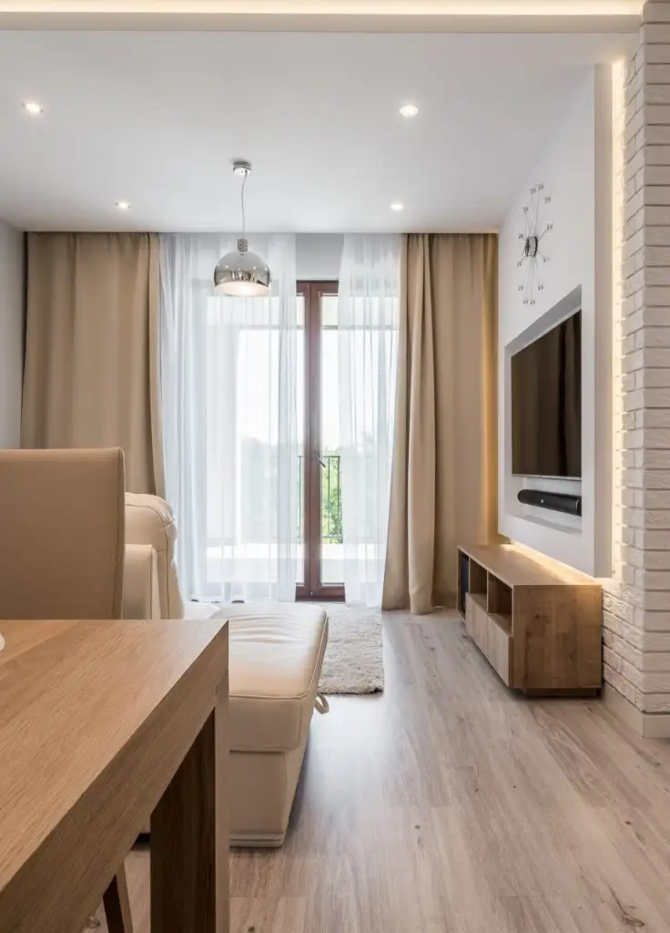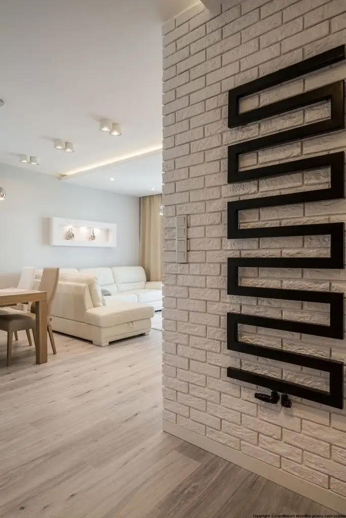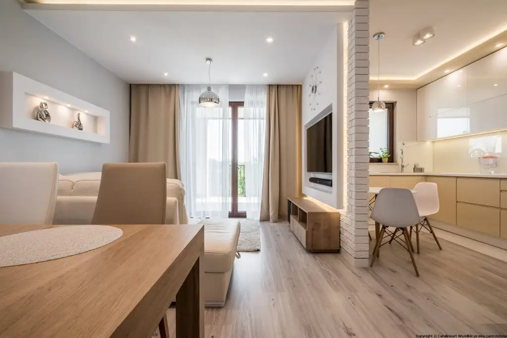 Structura acestuia se imparte in doua incaperi: living si bucatarie, separate discret de un perete de mici dimensiuni cu aspect de caramida. Acest tip de perete despartitor reprezinta solutia optima de a arata rolurile specifice fiecarei zone pastrand in acelasi timp coeziunea intre ele prin mentinerea unui spatiu larg, deschis.