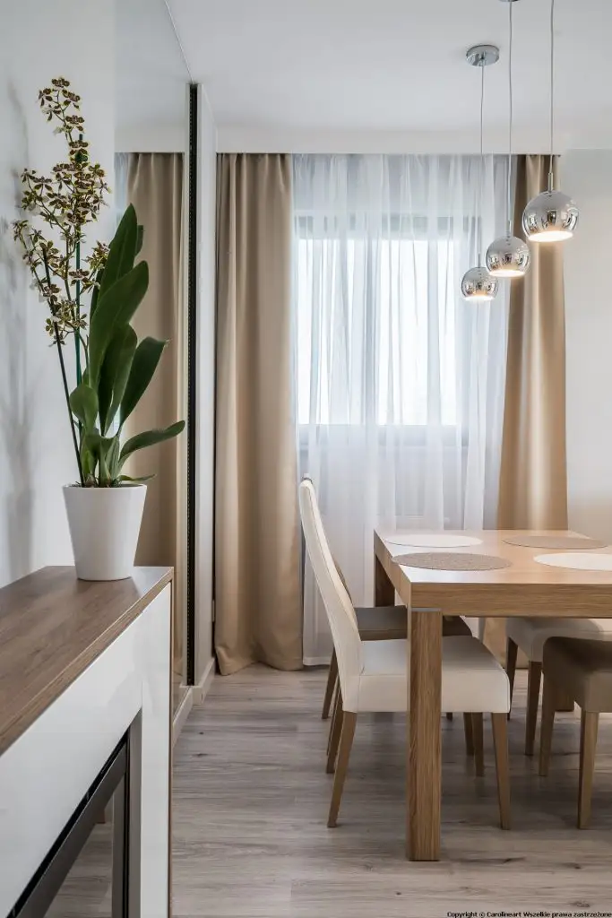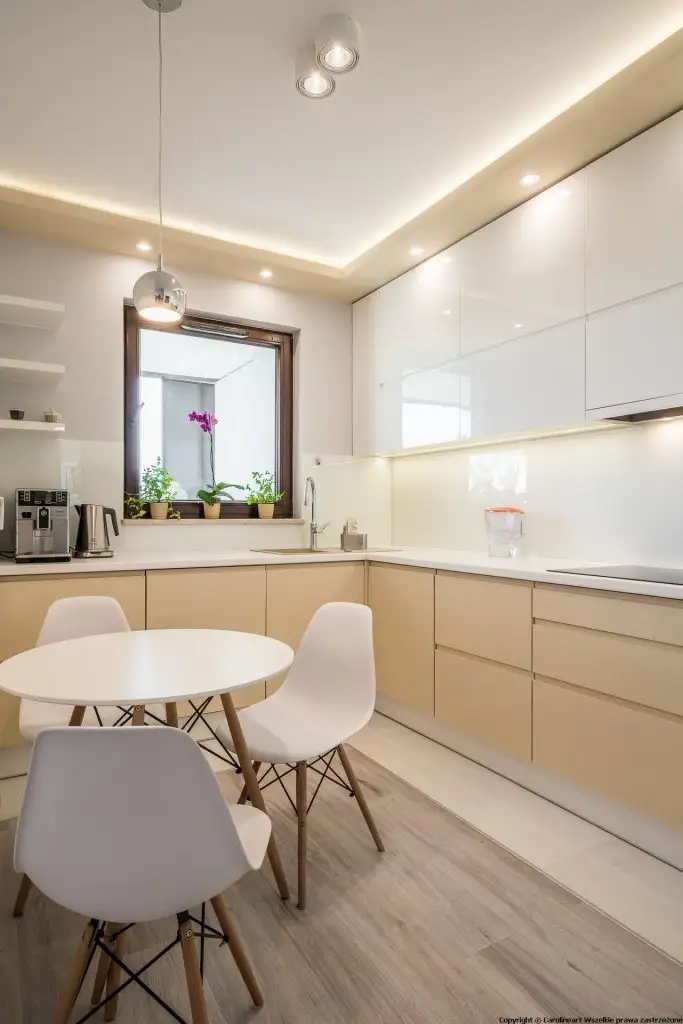 Din punct de vedere al cromaticii pastelurile reprezentate de beige, nud si lemn natural se completeaza cu accentele argintii ale acesoriilor cu iz luxuriant. Mobilierul bucatariei este minimalist si functional, simplitatea lemnului lucios accentuand eleganta intregii amenajari.