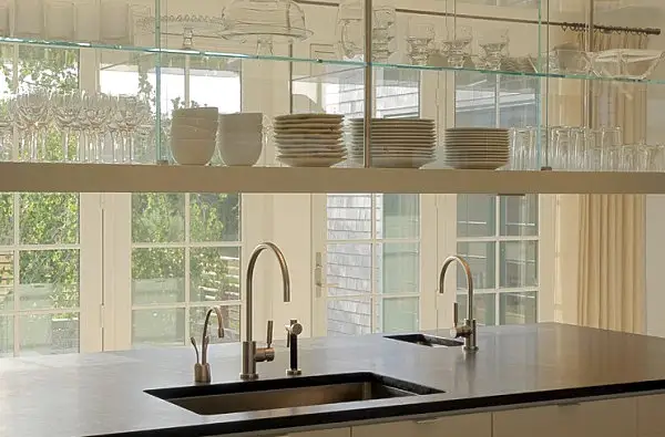 Bucataria este un alt loc in care puteti folosi cu incredere rafturile din sticla. Transparenta ramane si aici principala calitate de care puteti profita. Cu un aspect usor, aerisit, etajerele pot fi folosite pentru a stoca farfuriile si paharele intr-un mod in care sa nu afecteze vizibilitatea. Montate chiar in dreptul ferestrei, efectul va fi unul special.