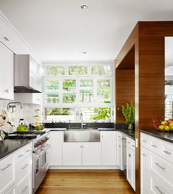 Etajerele din sticla ofera continuitate unui spatiu; trecerea dintre bucatarie si dining facandu-se usor, oferind intimitatea necesara si in acelasi timp pastrand deschiderea catre o alta camera.