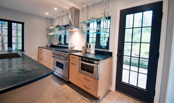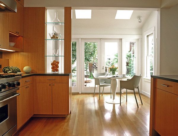 Etajerele din sticla ofera continuitate unui spatiu; trecerea dintre bucatarie si dining facandu-se usor, oferind intimitatea necesara si in acelasi timp pastrand deschiderea catre o alta camera.