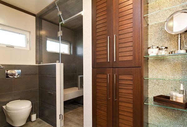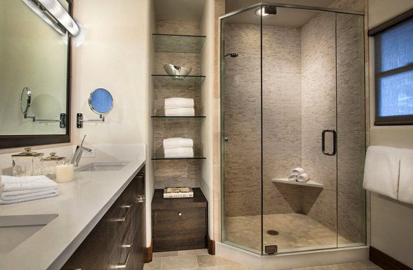In baie, sticla este in elementul ei. Rafturile ofera un aspect proaspat, curat, stralucitor, mai ales cand lumina sa reflecta in ele. Baile mici profita din plin de efectele sticlei, oferindu-le un efect de marire a spatiului prin claritate si transparenta.