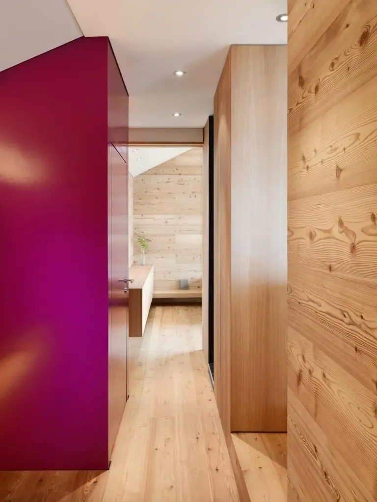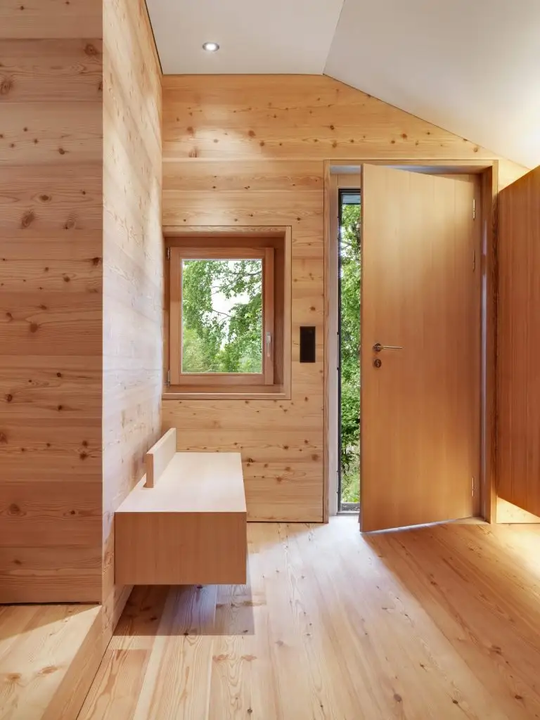 Pentru mobilier s-a folosit o versiune de furnir din lemn de larice, nunata acestuia oferind un aspect mai sofisticat decat lemnul folosit pentru pereti si podele.