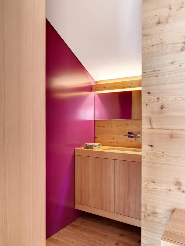 Baia are parte de o altfel de abordare, unul din pereti este din sticla colorata, intr-o nuanta plina de viata care face ca acest spatiu sa se diferentieze de celelalte camere.