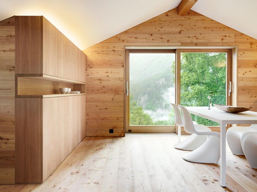 Spatiul din cabana este excelent configurat, dulapuri fara manere sunt situate in zonele din bucatarie si dormitor asigura functionalitatea cabanei. La intrarea in cabana este plasata o banca suspendata care permite nu numai o asezare confortabila dar ascunde, in mod inteligent, si incaltamintea.