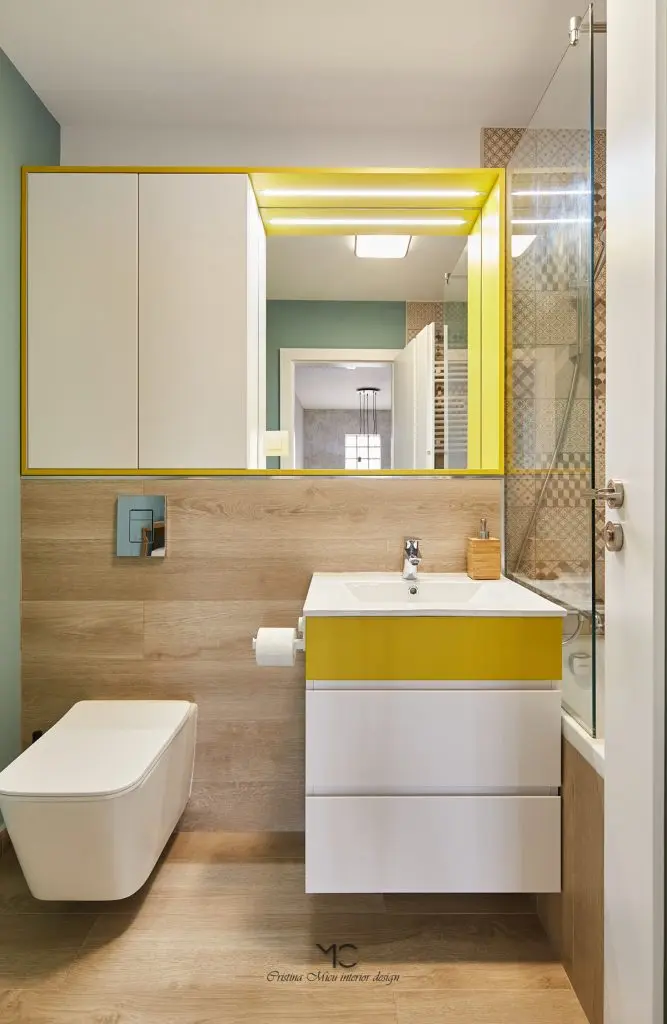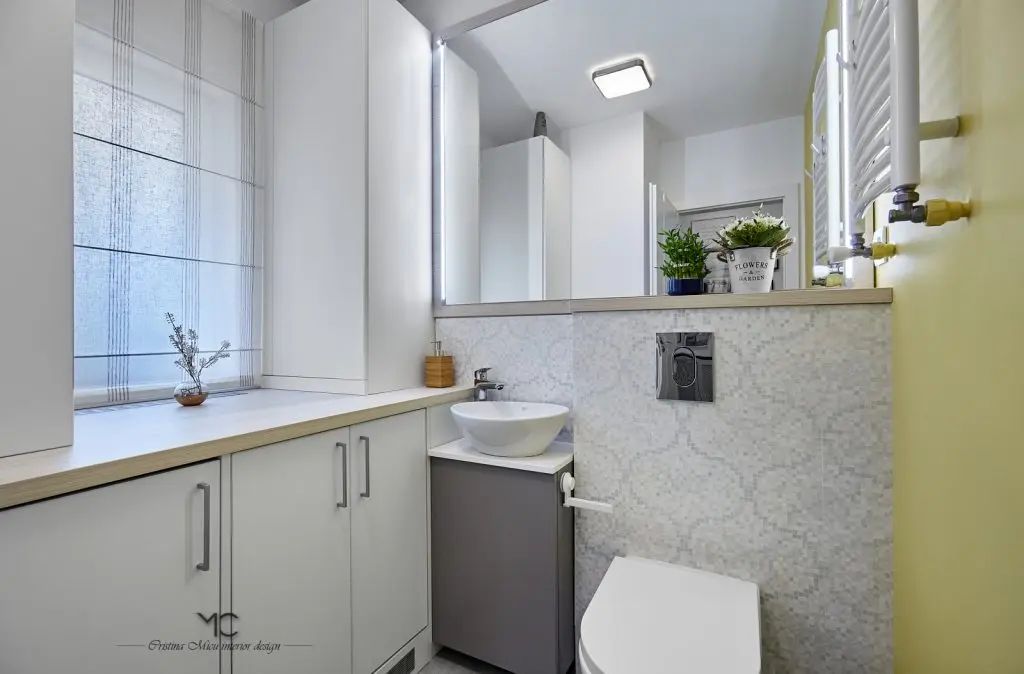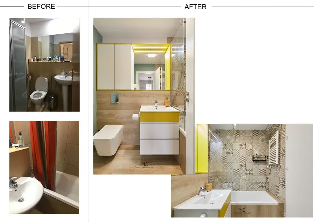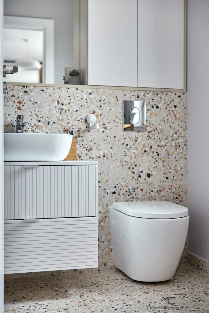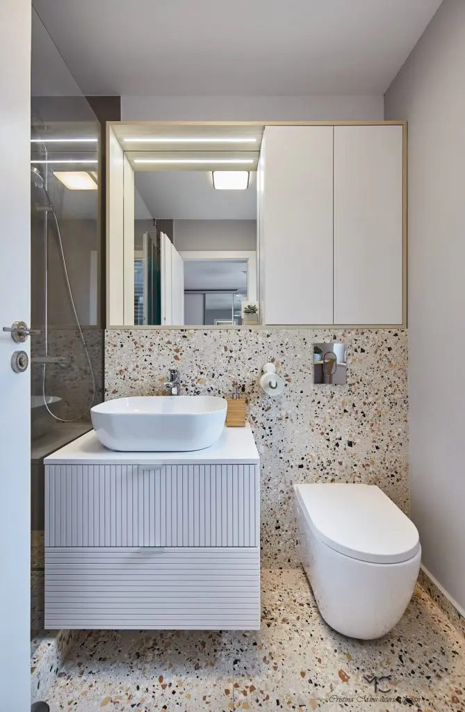 In baia matrimoniala arhitectii au propus un “dus walk in in locul vechii cazi, iar la nivel de finisaje s-a folosit preponderent terrazzo, completat de placi ceramice ce imita lemnul, amplasate acolo unde zonele sunt expuse apei. Pentru eficientizarea bugetului, pe restul peretilor s-a folosit vopsea lavabila gri potrivita pentru spatii umede.”