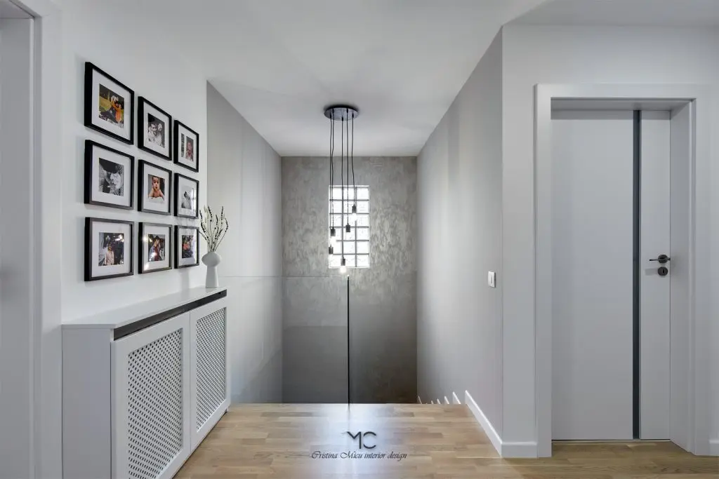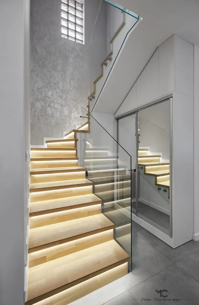 Din amenajarea initiala s-au pastrat parchetul si finisajul treptelor , la care s-a adaugat o lumina de accent (benzi de led cu senzor). In rest, au fost inlocuite toate finisajele, iar la parter a fost introdusa si incalzirea in pardoseala.